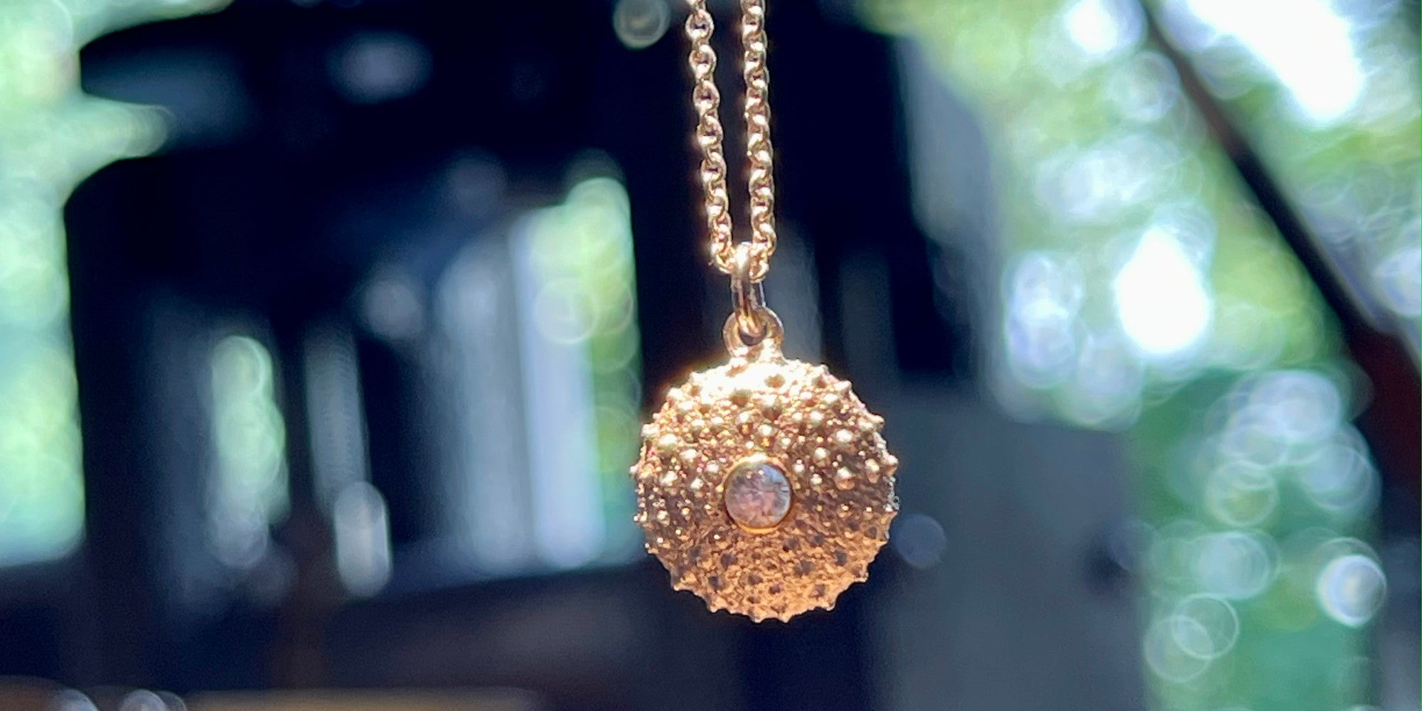 Small, solid pendant in the shape of a gold disc with a hammered surface texture that constantly reflects the light, creating a beautiful sparkle.