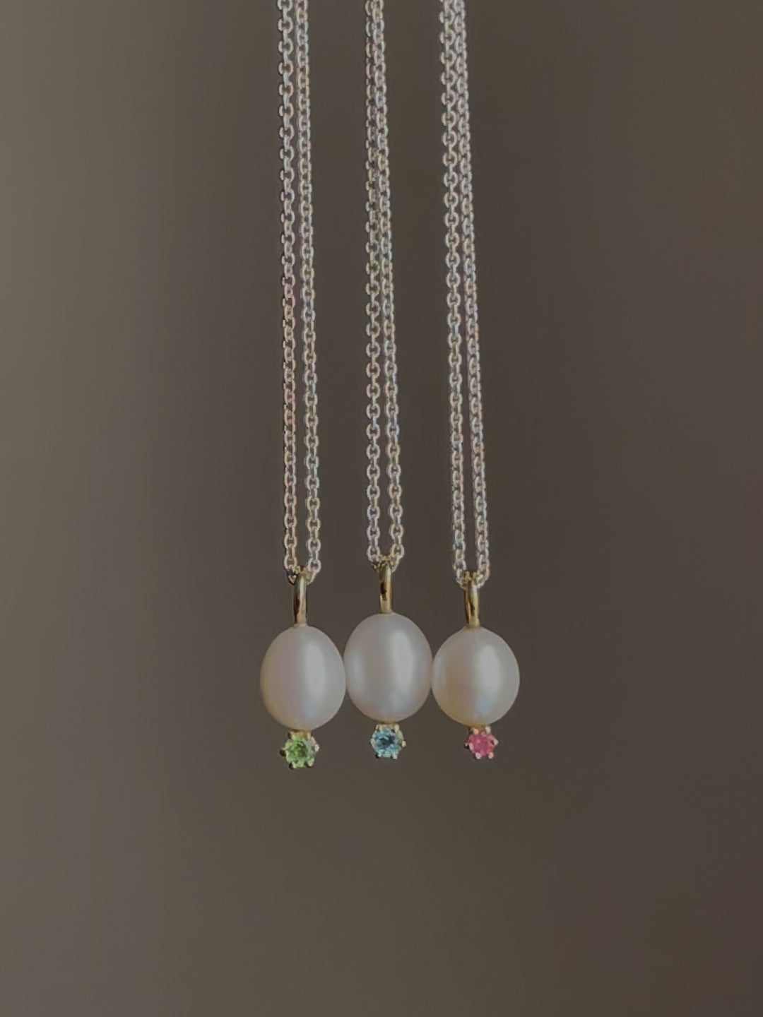 Eine besondere Halskette bestehend aus einem Anhänger mit einer Süßwasserperle und einem kleinen Tsavorit in wunderschönem grün. Der Anhänger wurde in sorgfältiger Handarbeit in Goldschmiedearbeit hergestellt. Die Fassung des Steins und die Öse sind aus 18K Gold gefertigt und die zierliche Halskette besteht aus Sterling Silber. Der Anhänger ist abnehmbar und kann deshalb auch an anderen Ketten getragen werden.